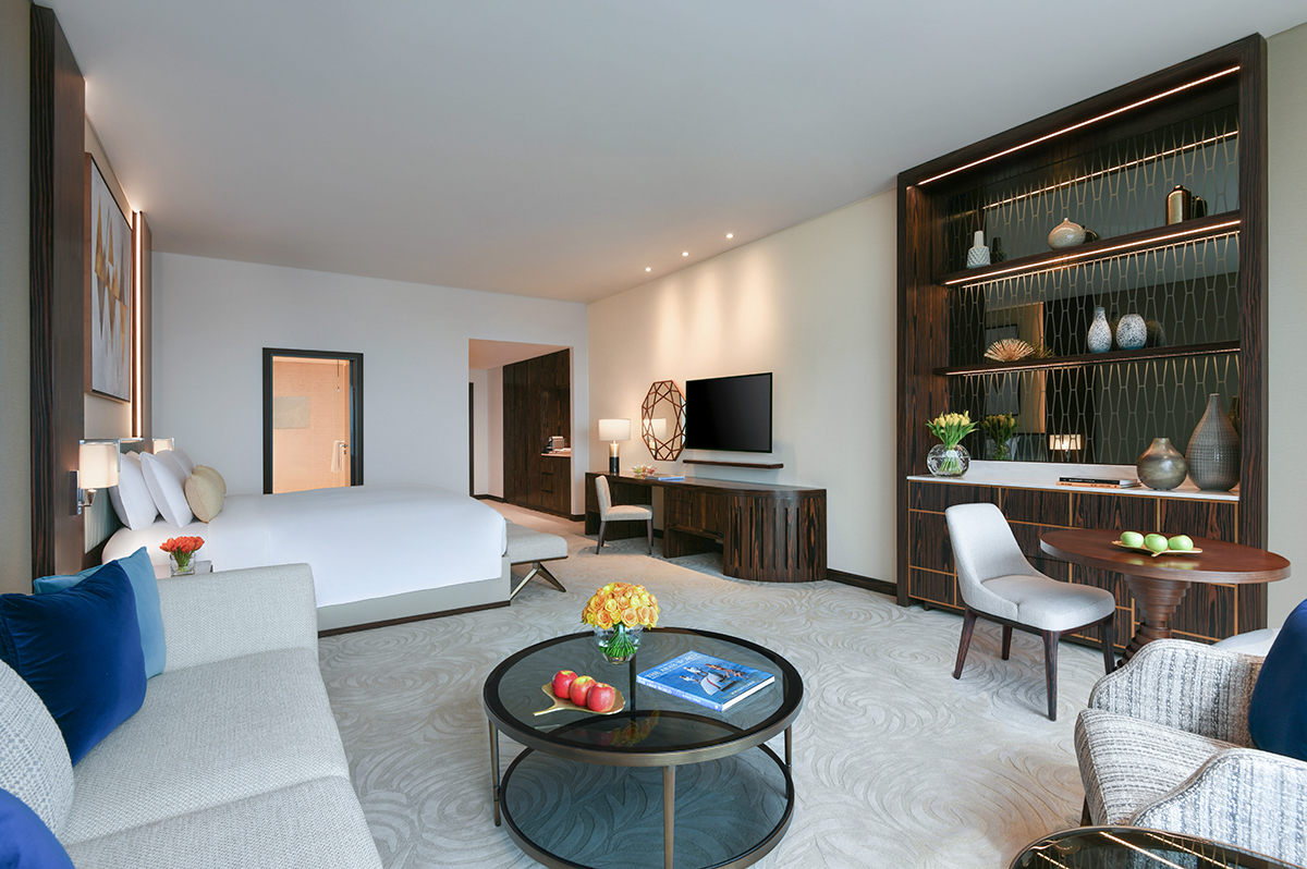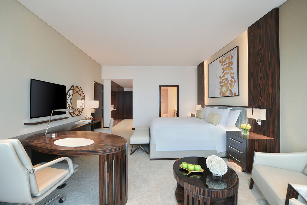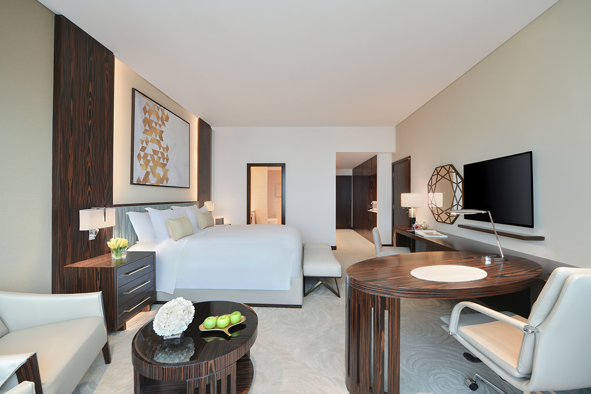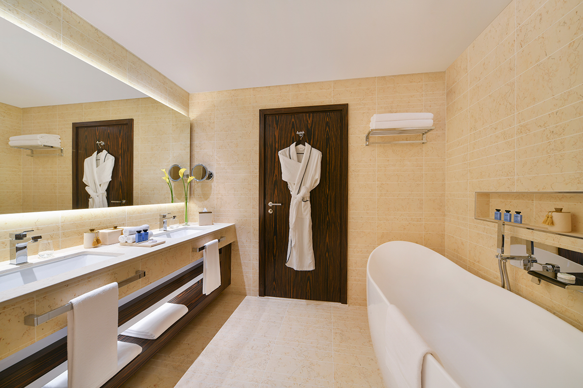В однокомнатном номере гости размещаются на двуспальной кровати king-size, имеется рабочее место, зона отдыха, санузел с душем, ванной, феном, банными принадлежностями. В числе удобств Wi-Fi, кондиционер, телевизор, сейф, мини-бар, телефон, холодильник, кофемашина Nespresso, набор для приготовления чая и кофе, халаты и тапочки, доступ в представительский лаундж.